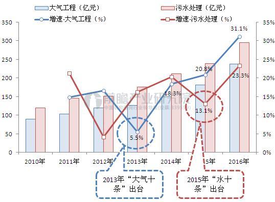根據前瞻產業研究院發布的《2017-2022年中國環保行業發展前景與投資預測分析報告》數據顯示,2013年“大氣十條”出臺后,2014年、2015年大氣污染治理增長率分別為18.3%、20.8%,而2013年這一數值僅為5.5%;2015年“水十條”出臺后,2016年污水處理增長率為23.3%。